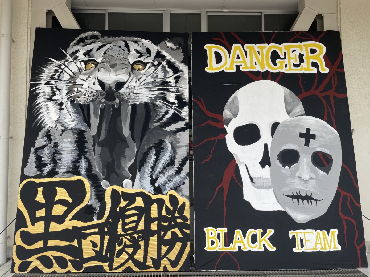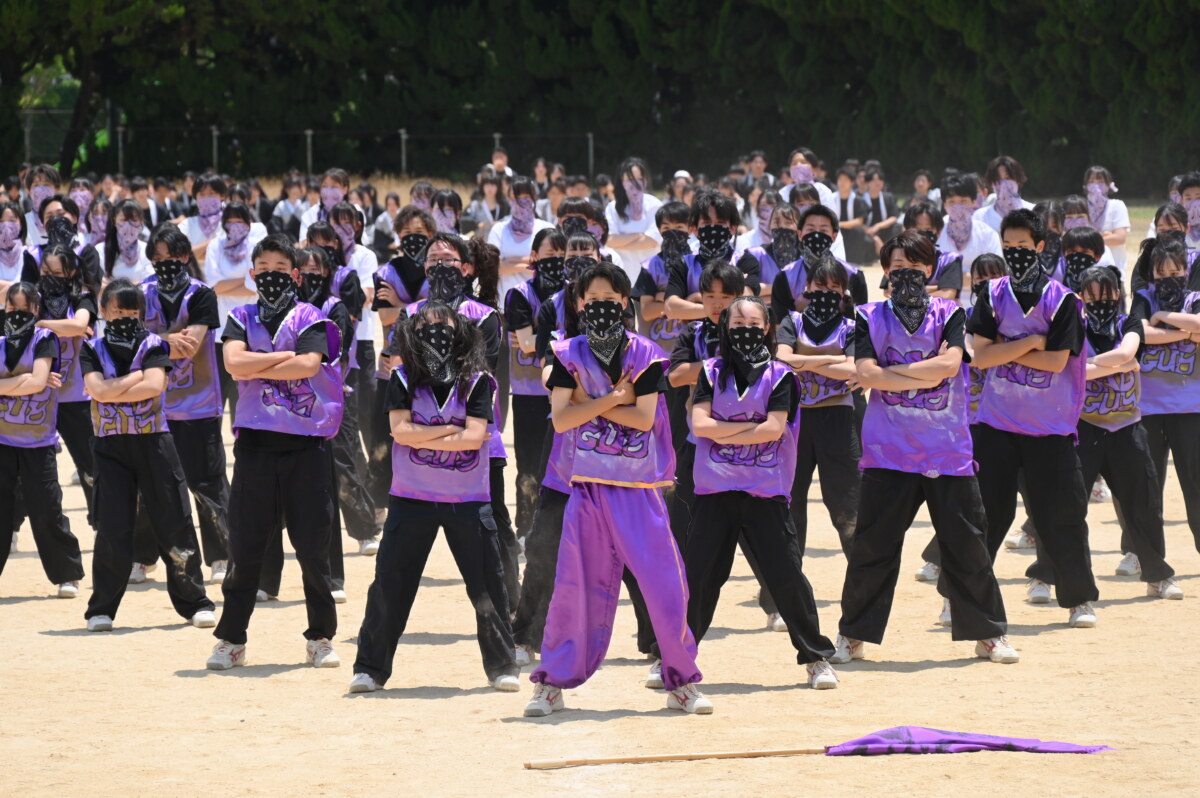 今年から各学年2クラス×3学年の合計6クラスを1団とした3団での体育祭です。ちなみに今年の団カラーは『赤団・紫団・黒団』です。