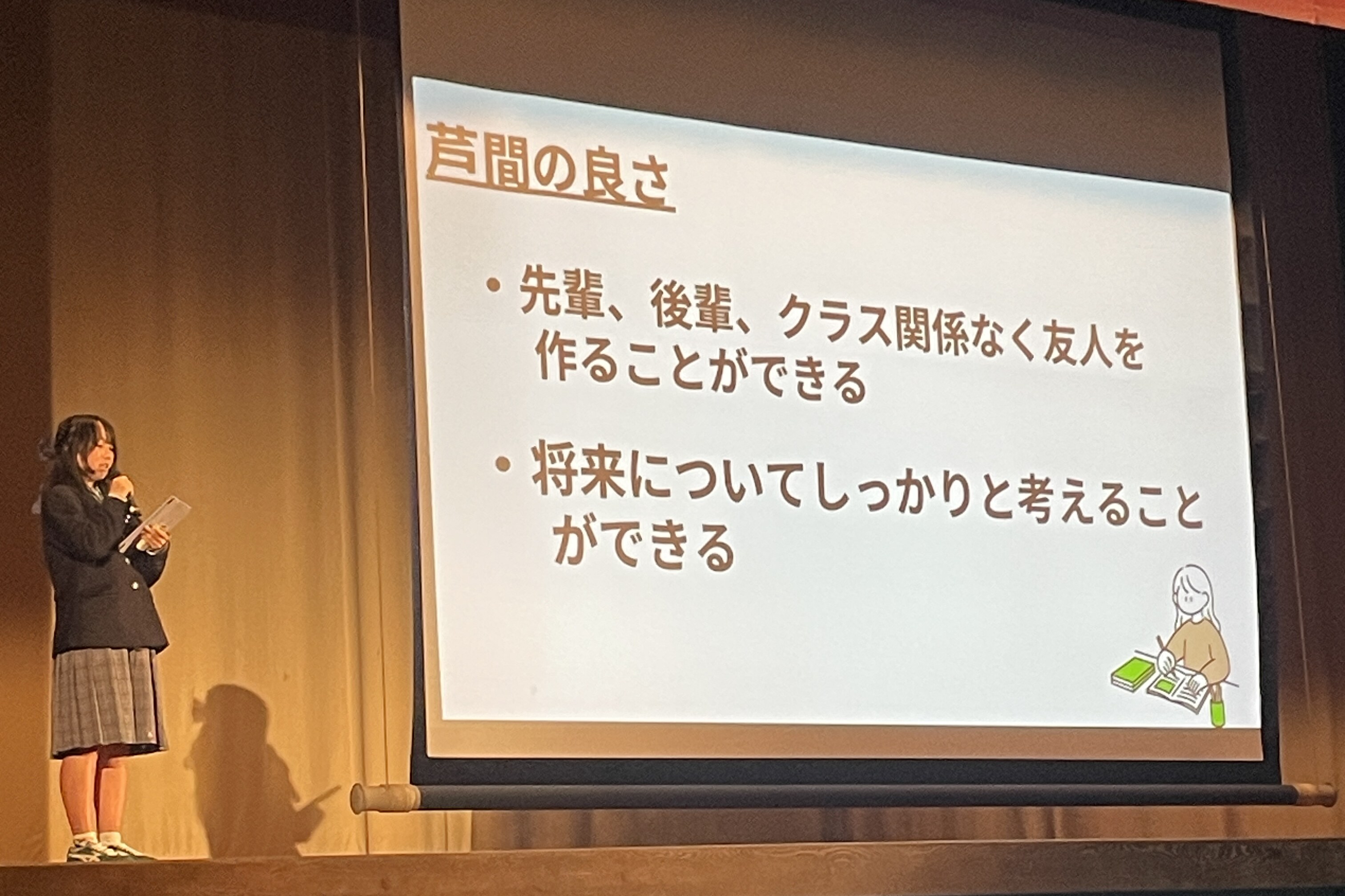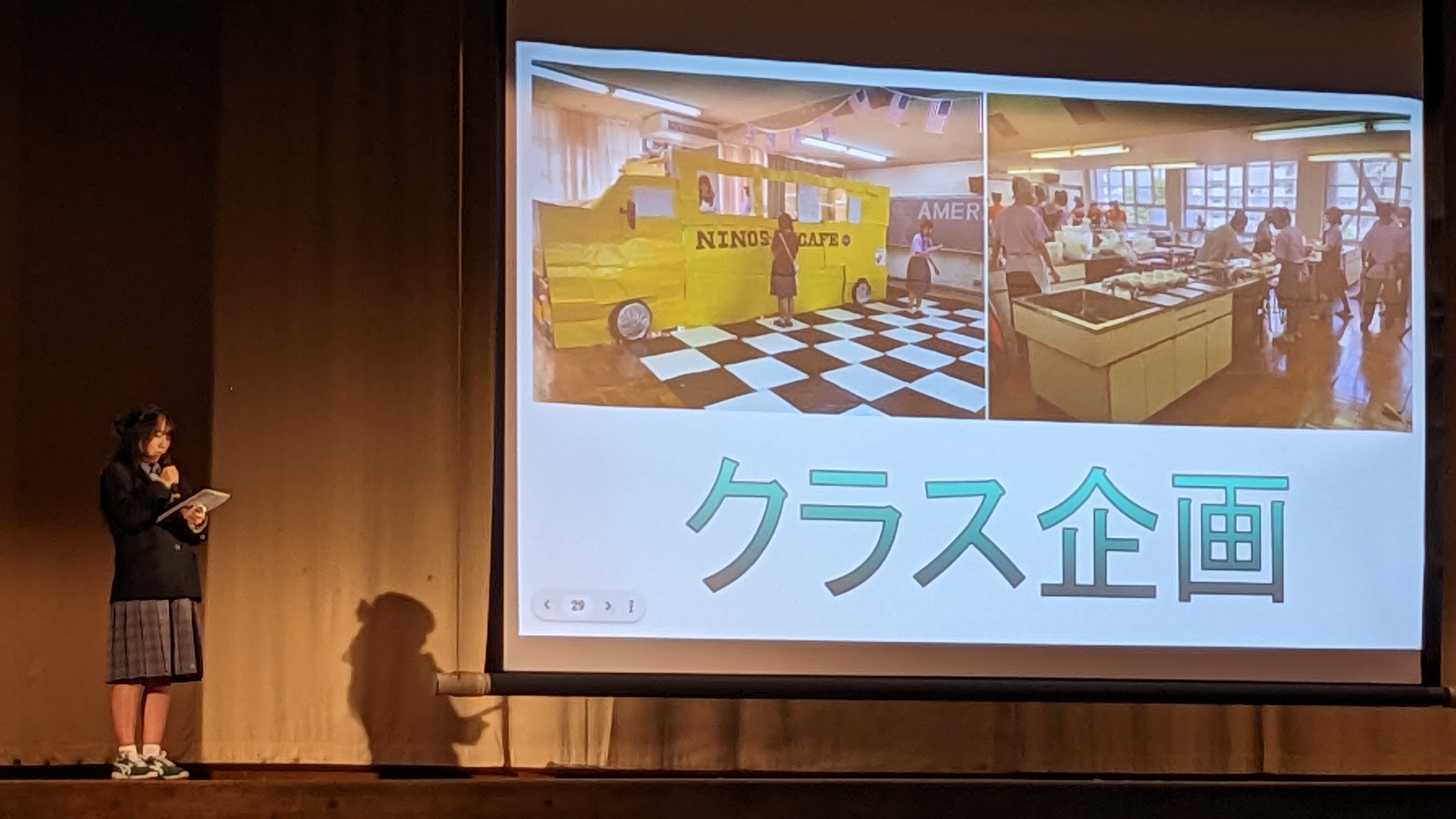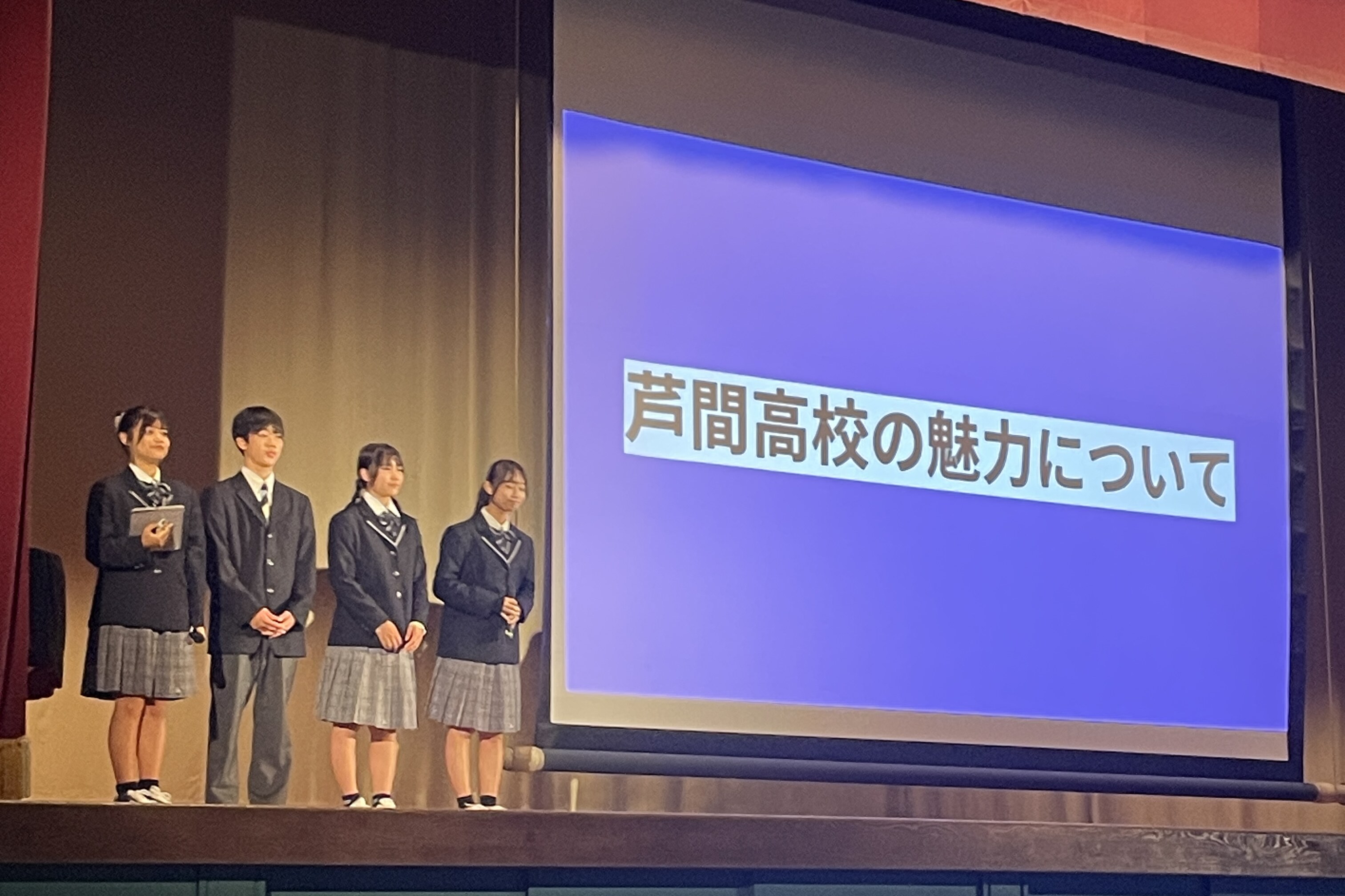 10月と11月に中学生に向けておこなわれるオープンスクールの全体会の中身を考え、スライド作成等の準備をおこない、当日の進行まで生徒会でおこなっています。