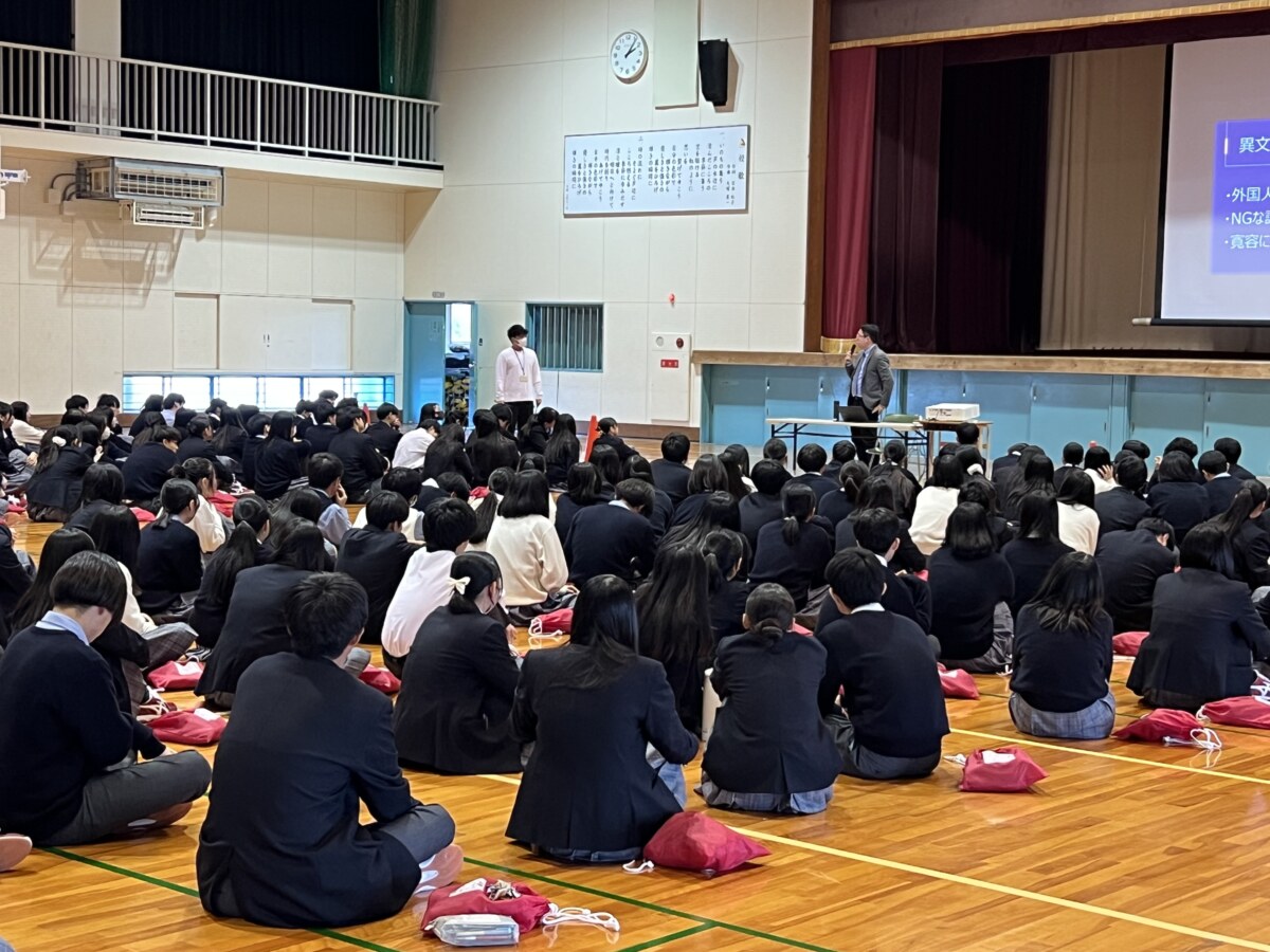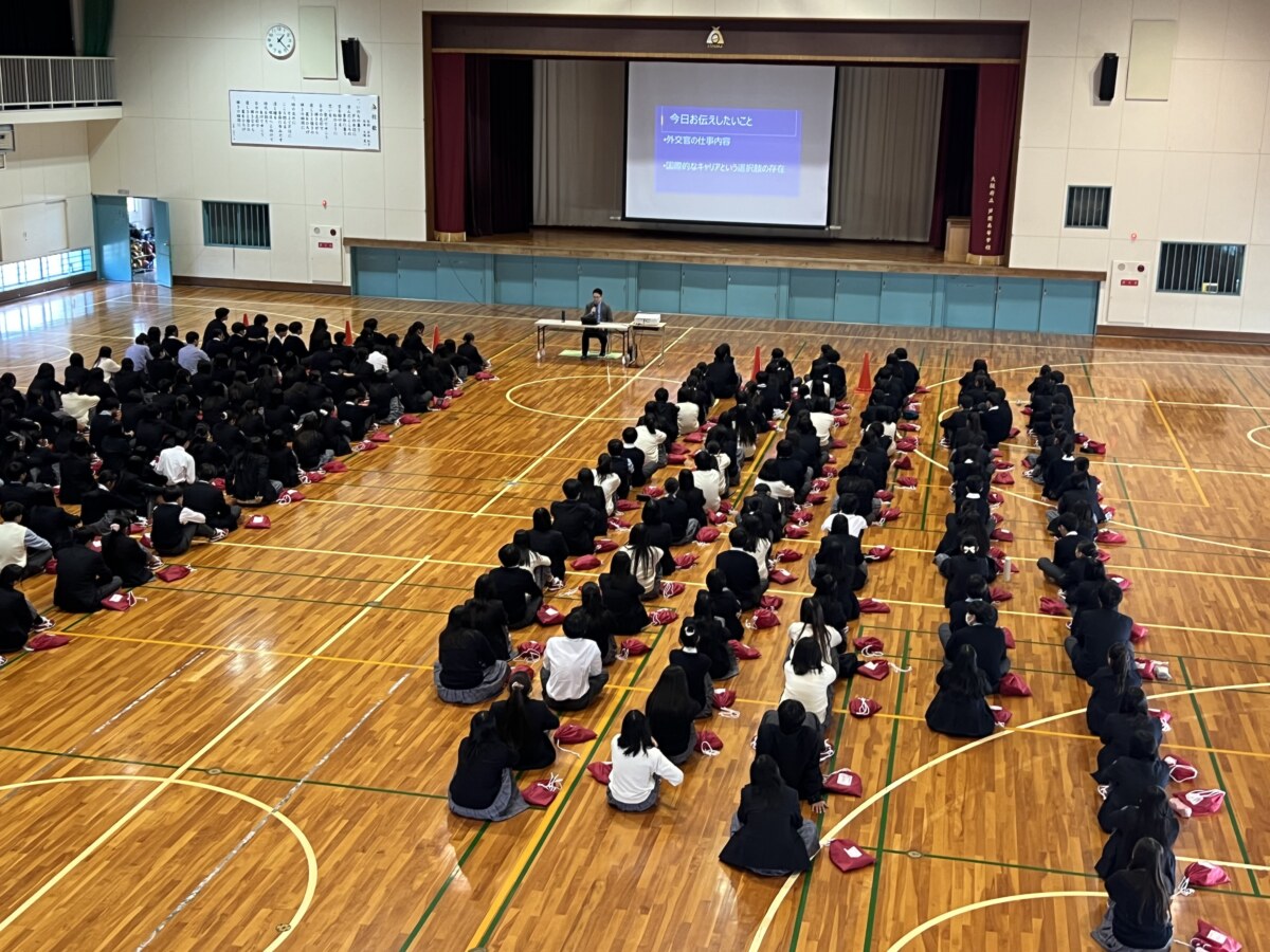 5限に、外務省欧州局より講師を派遣していただき、「高校講座」を実施しました。講演内容は、外務省や外交官としての仕事内容に加え、国際交流の秘訣や英語学習をすると選択肢が増える等のアドバイスなど幅広いものでした。生徒たちは将来の選択肢が増えたり、海外に興味をもつきっかけになったようでした。また、ご講演後数名の生徒は講師の方に積極的に質問をしていました。とても充実した講演会となりました。講師の西田さま、ありがとうございました。