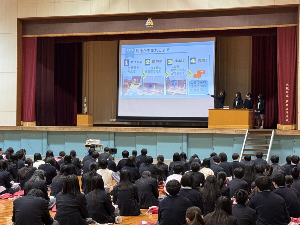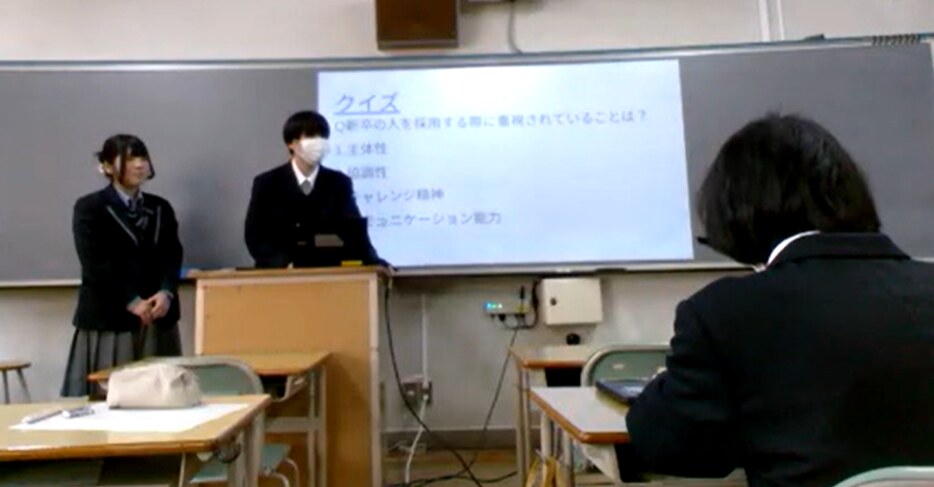 また1年生からは、「産業社会と人間」のジョブカバリー(各班で、関心のある仕事・職業について、会社に直接インタビュー訪問をして、それぞれ調べたことを発表)について、学年から代表の12班が合同発表してくれました。(1年生は11月に学年発表をしています。)